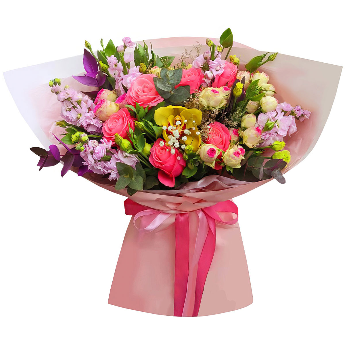 Орхидея желтая, роза кустовая белая, роза одноголовая розовая, маттиола сиреневая, эвкалипт. Упаковка (лента, пленка, крафт, сетка, пленка матовая)