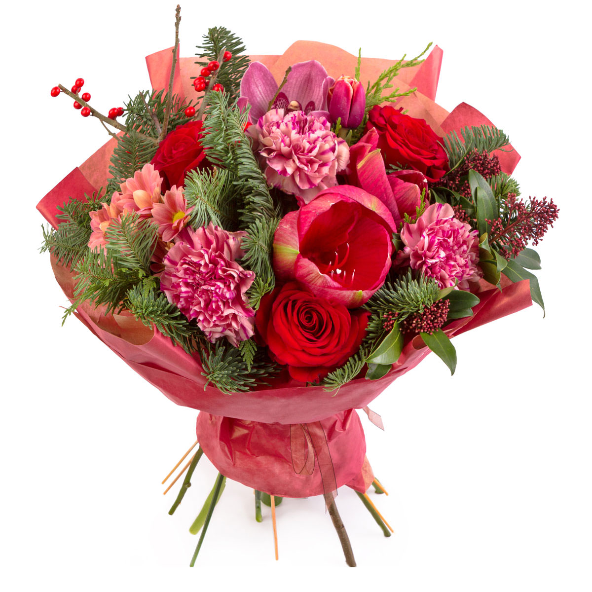Роза одноголовая красная, амариллис, орхидея розовая, хризантема кустовая розовая, пион, илекс, пихта. Упаковка (лента, пленка, крафт, сетка, пленка матовая)
