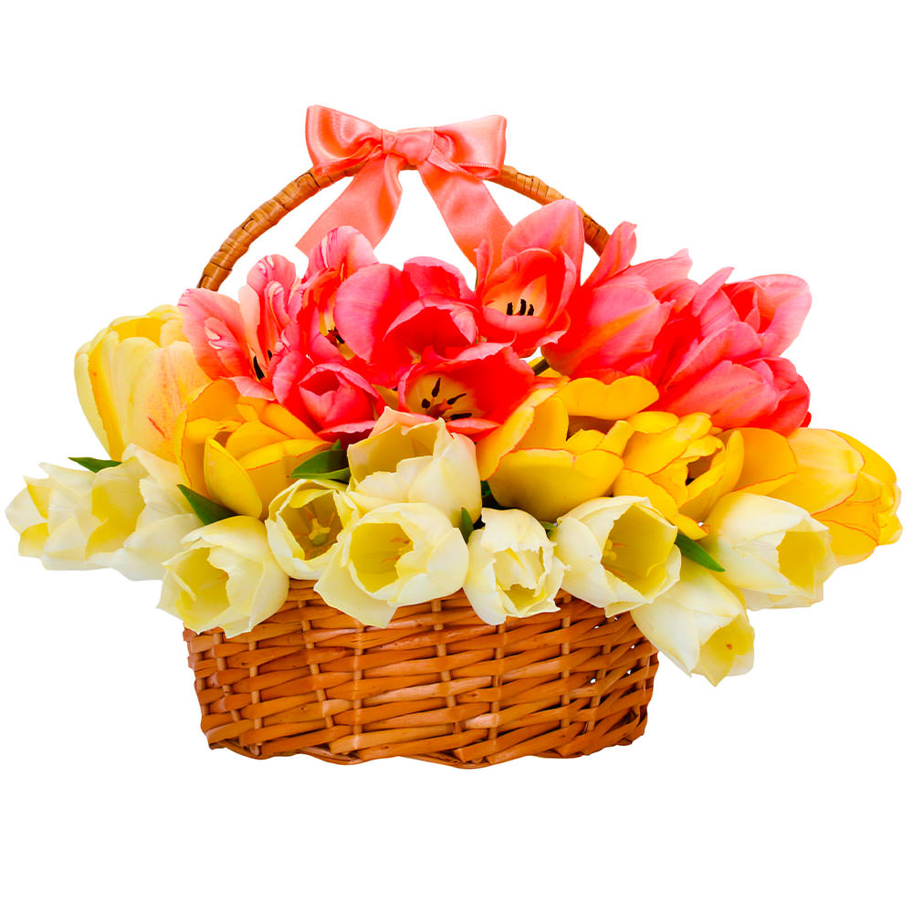 Тюльпан розовый, тюльпан белый, тюльпан желтый. Упаковка (Корзина, оазис).