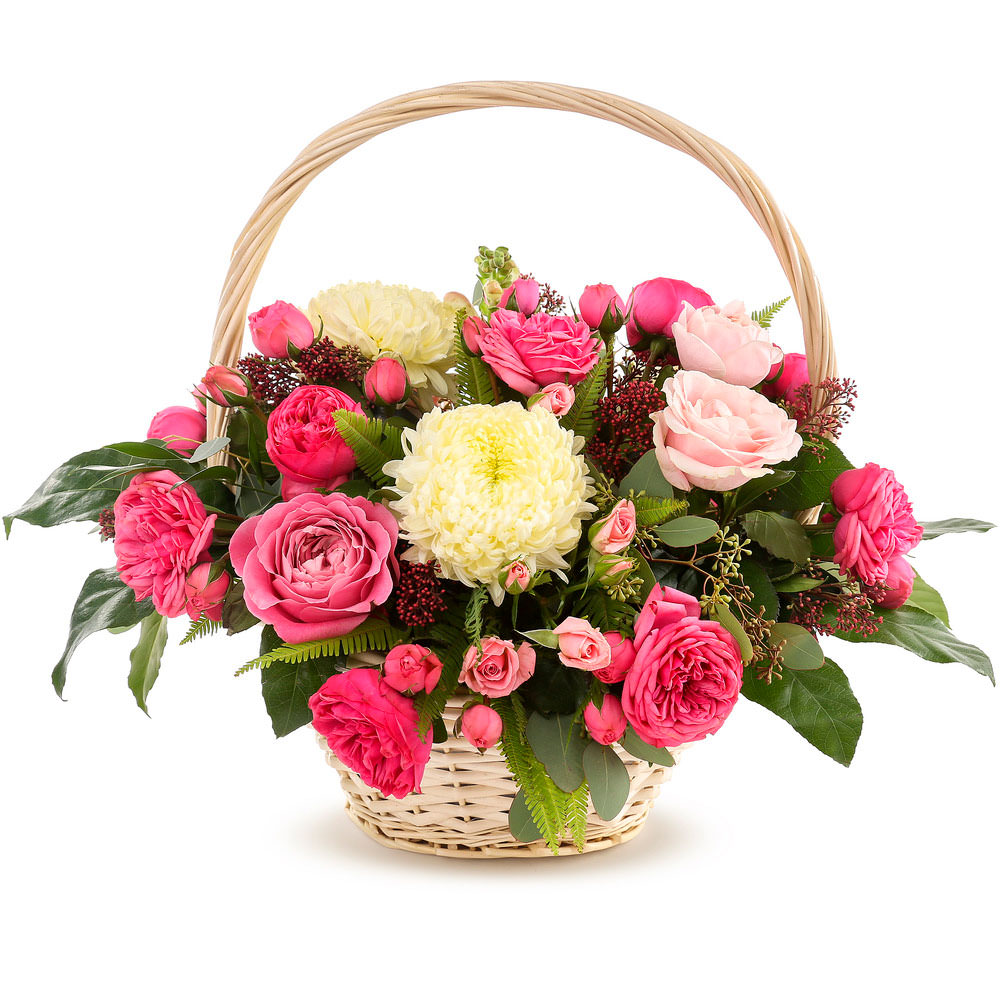 Скимия, роза кустовая розовая, хризантема одноголовая белая, папоротник, эвкалипт, аралия, роза одноголовая розовая. Упаковка (Корзина, оазис).